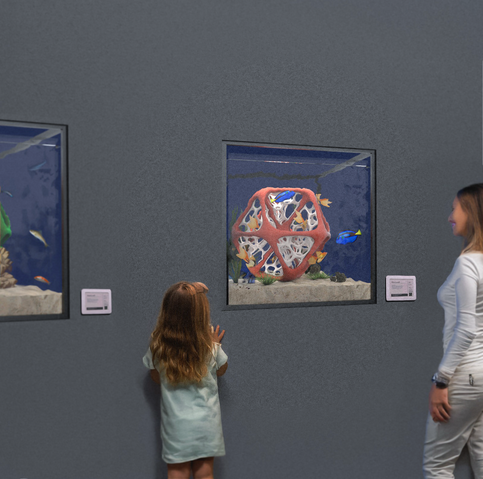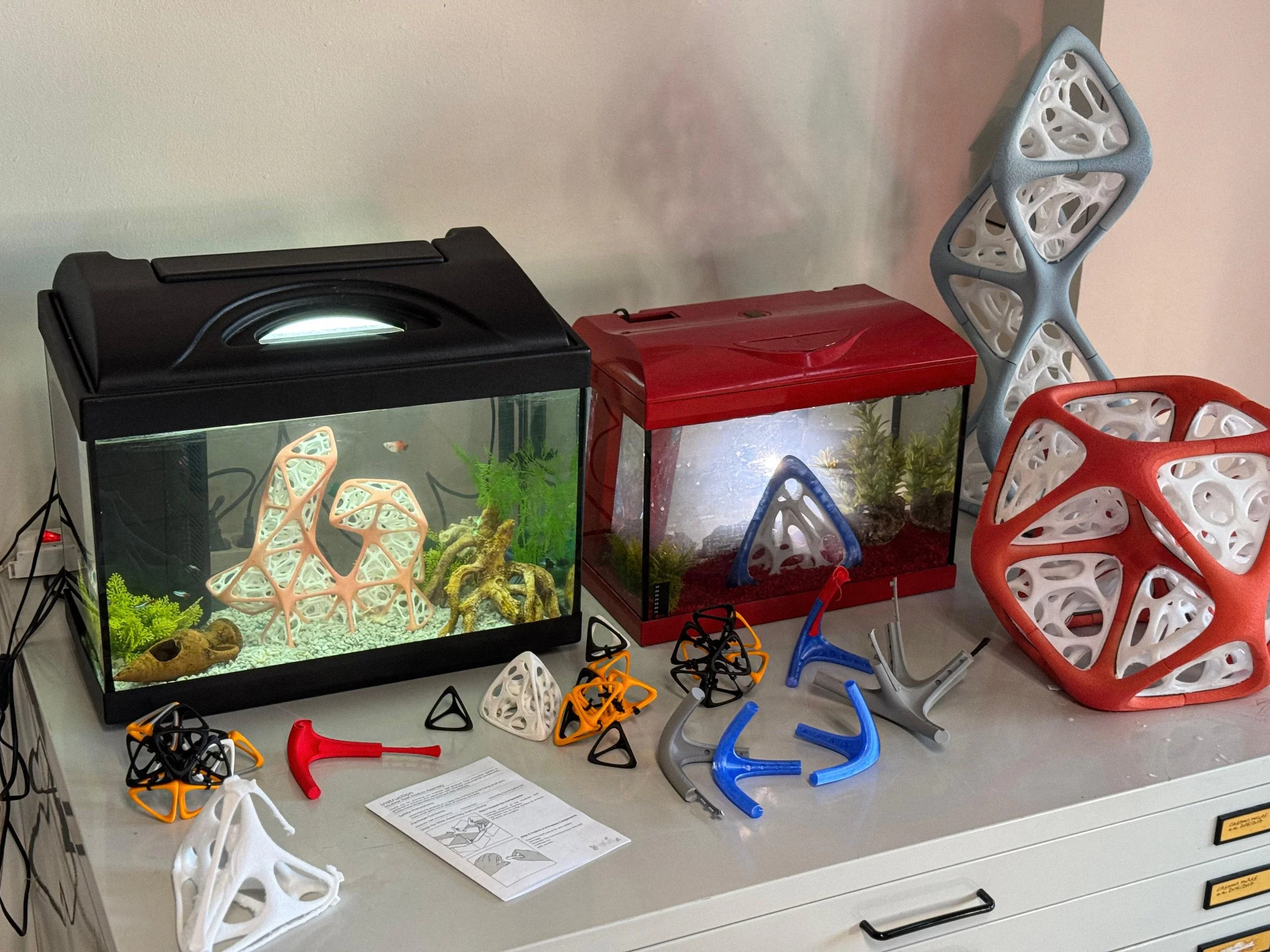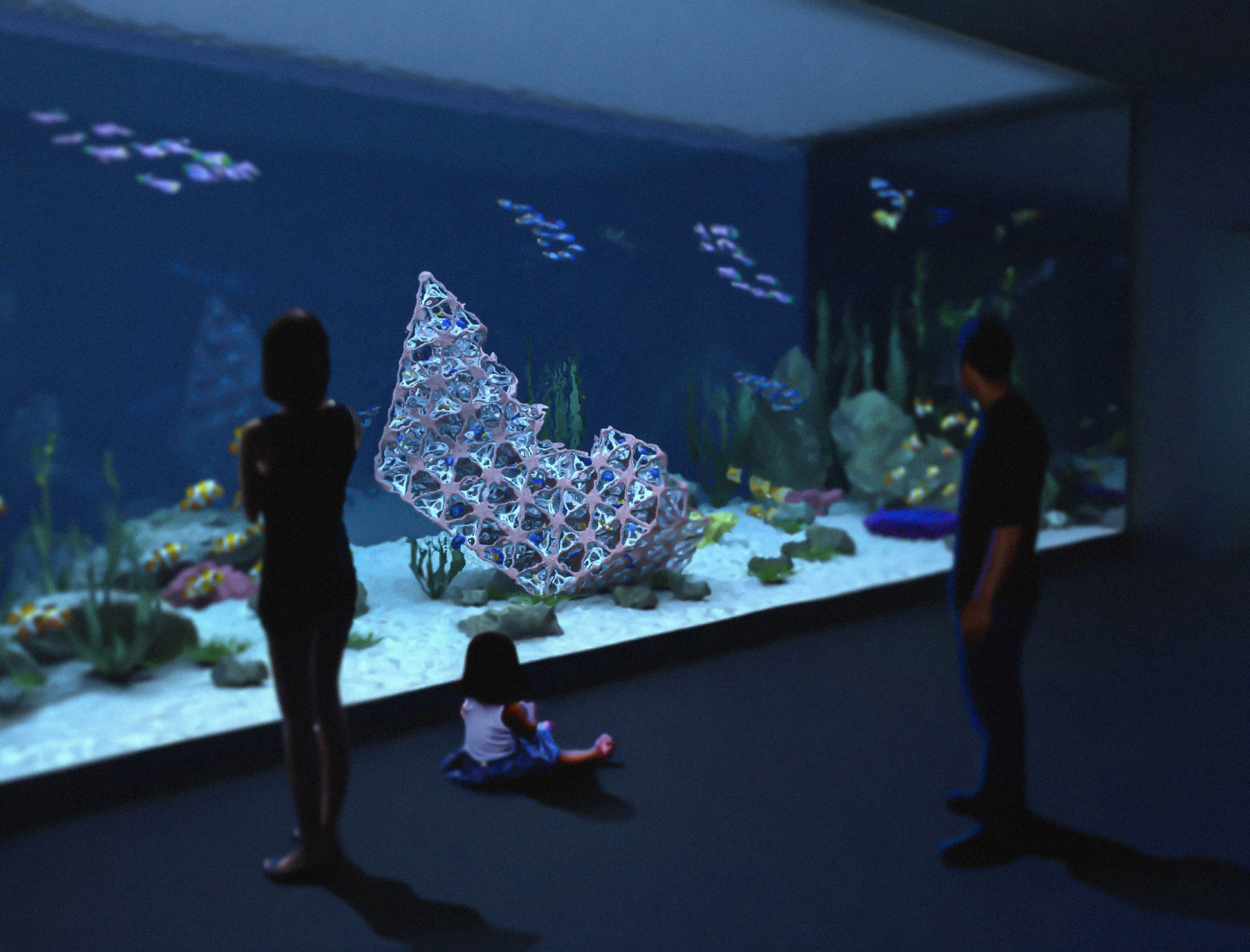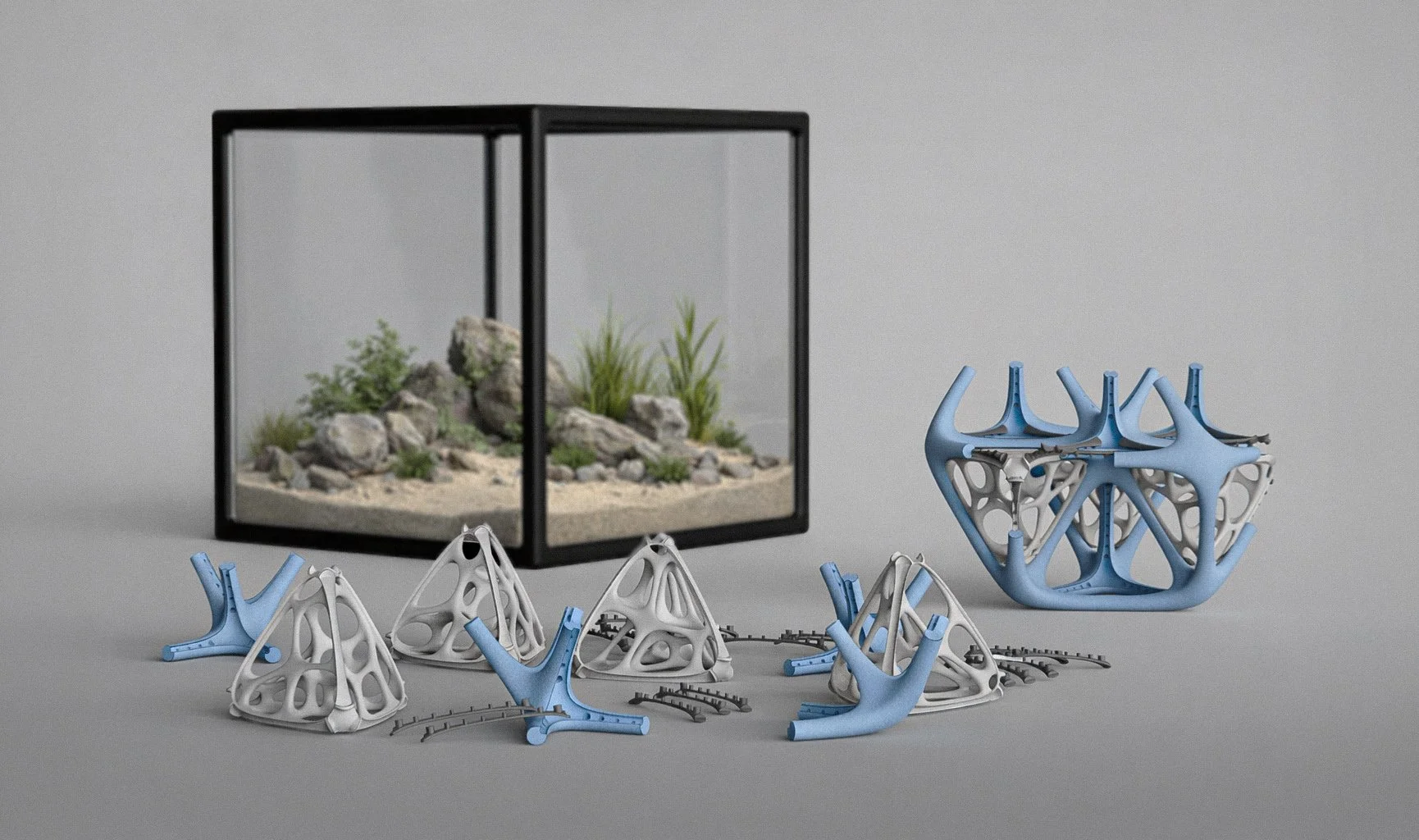 A coral-inspired product created using additive manufacturing, featuring a triangular modular structure that mimics the functions of natural corals without directly copying them, offering sustainability and flexibility through various connectors that enable amorphous and adaptable forms.