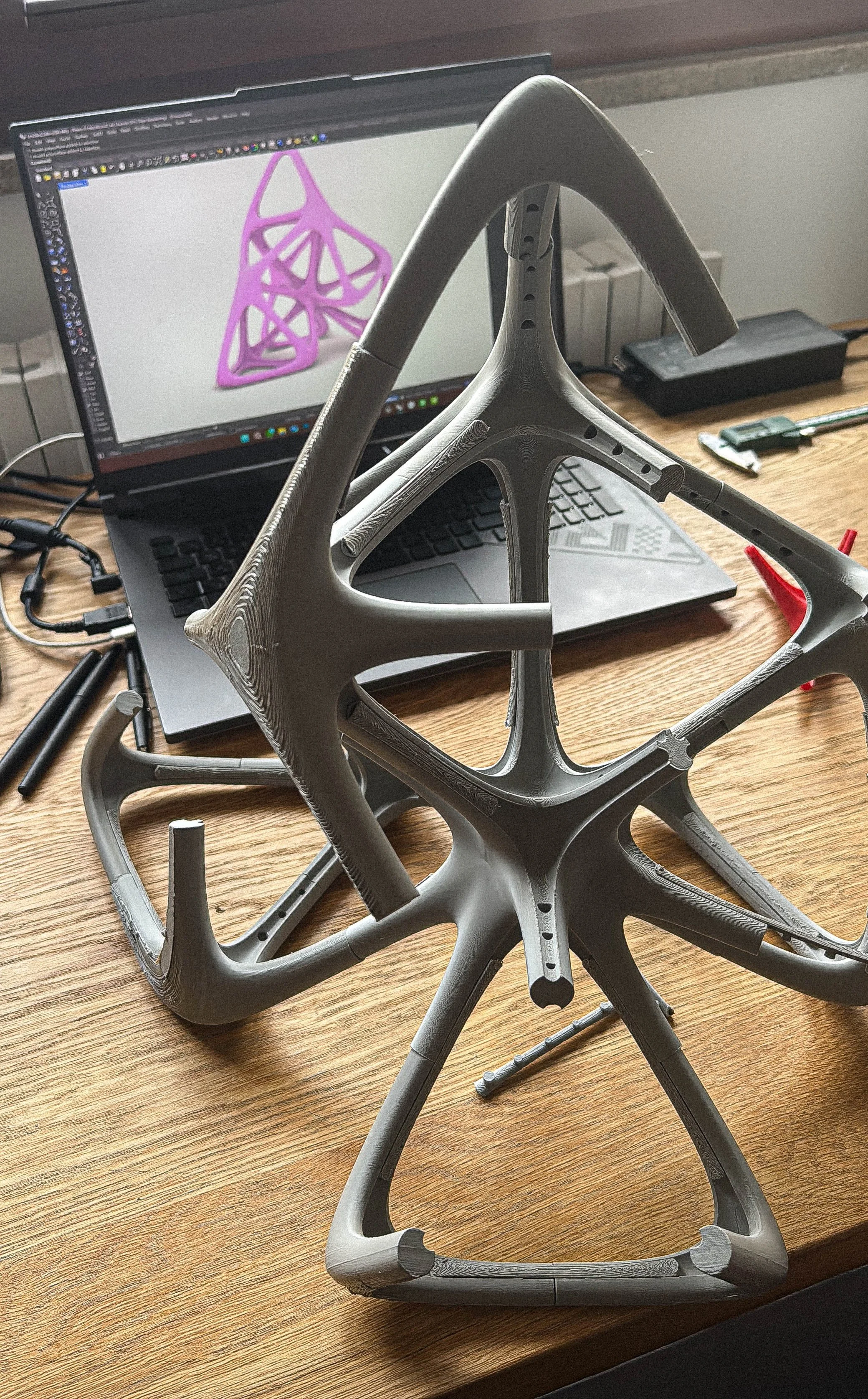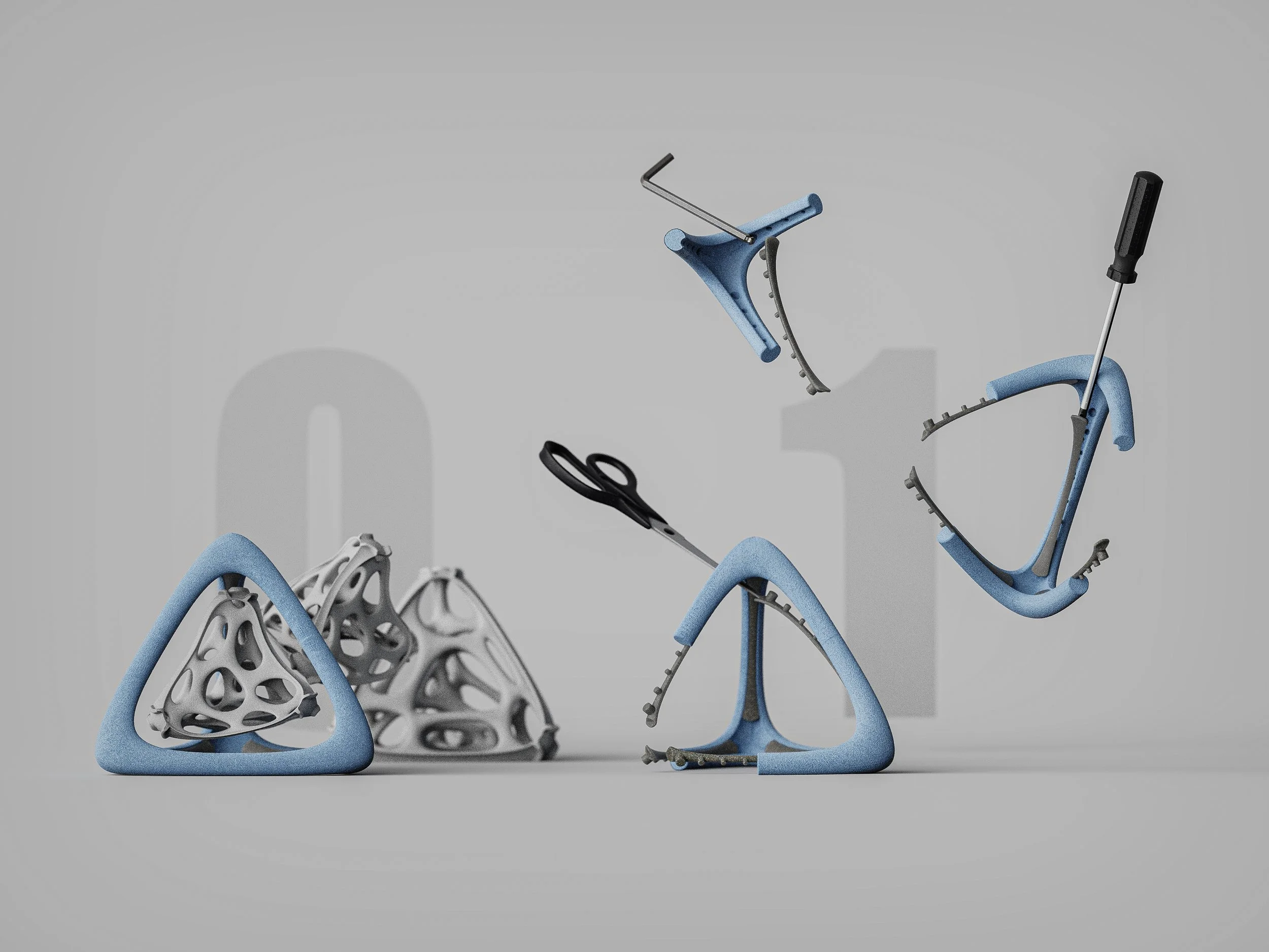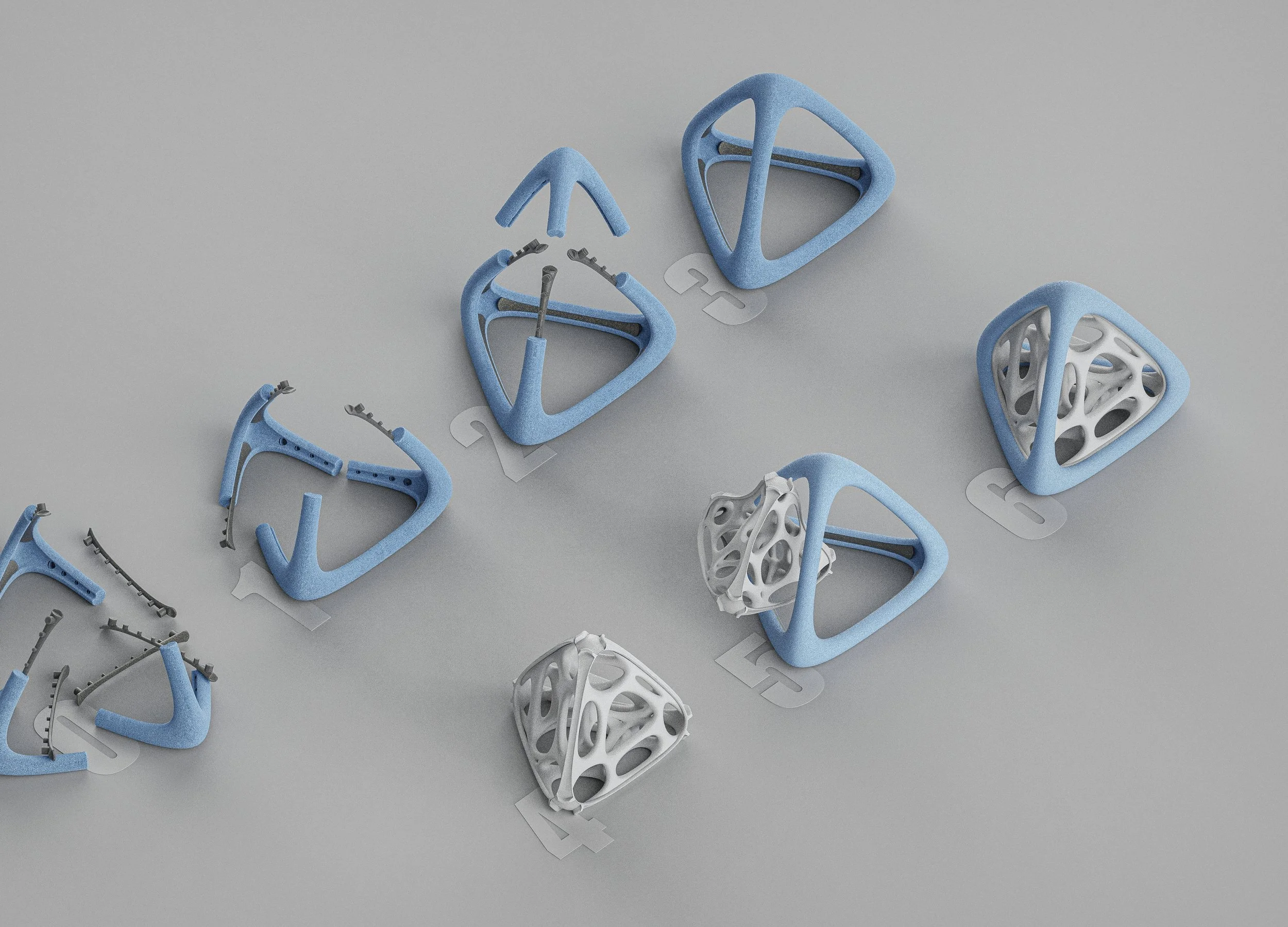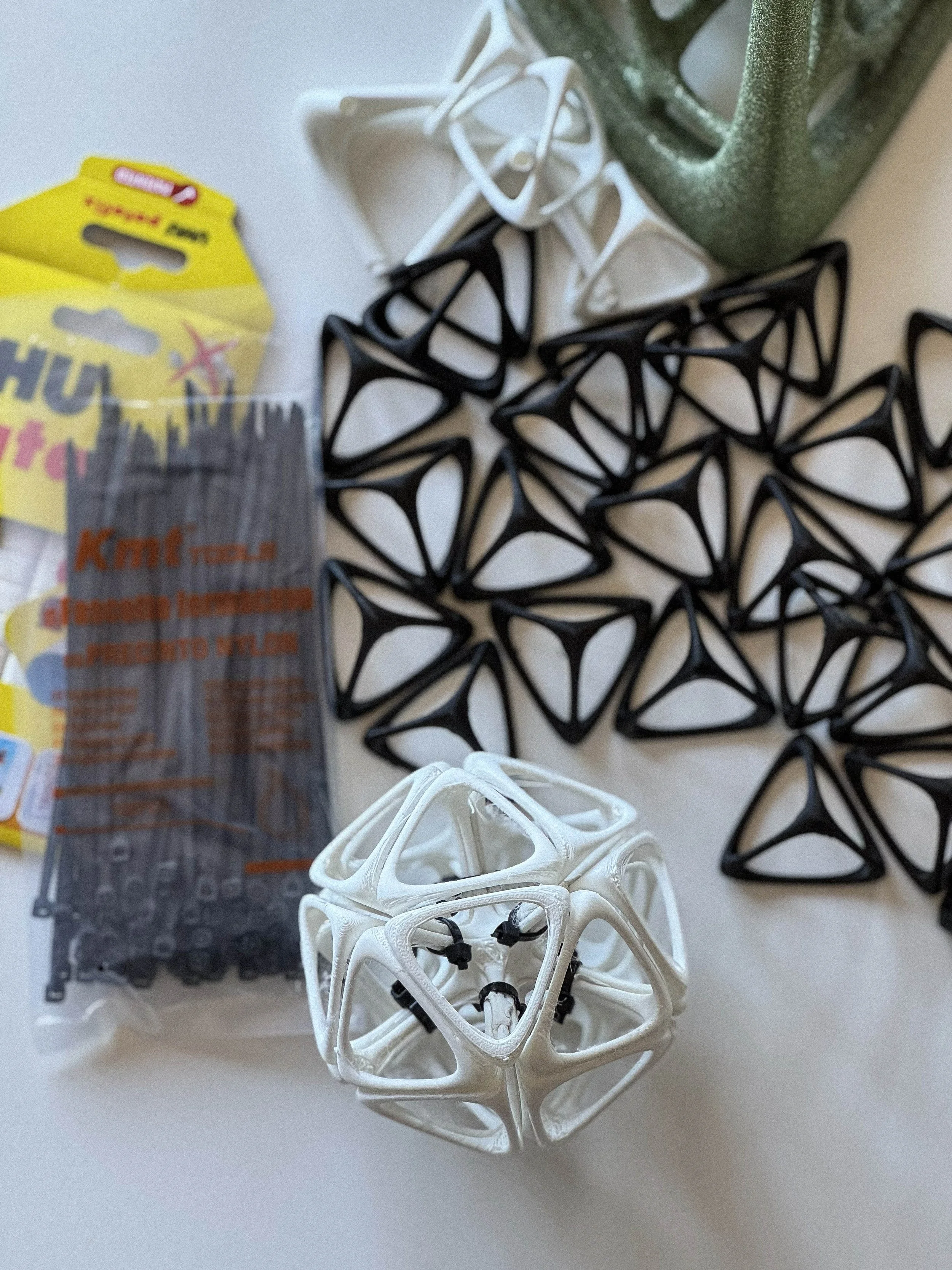 The tetrahedrons are connected to each other using two key components. The first are frames, parametrically designed based on the client’s preferences. The second are injection-molded connector pins made from an elastic material, which are universal for all frame pieces.