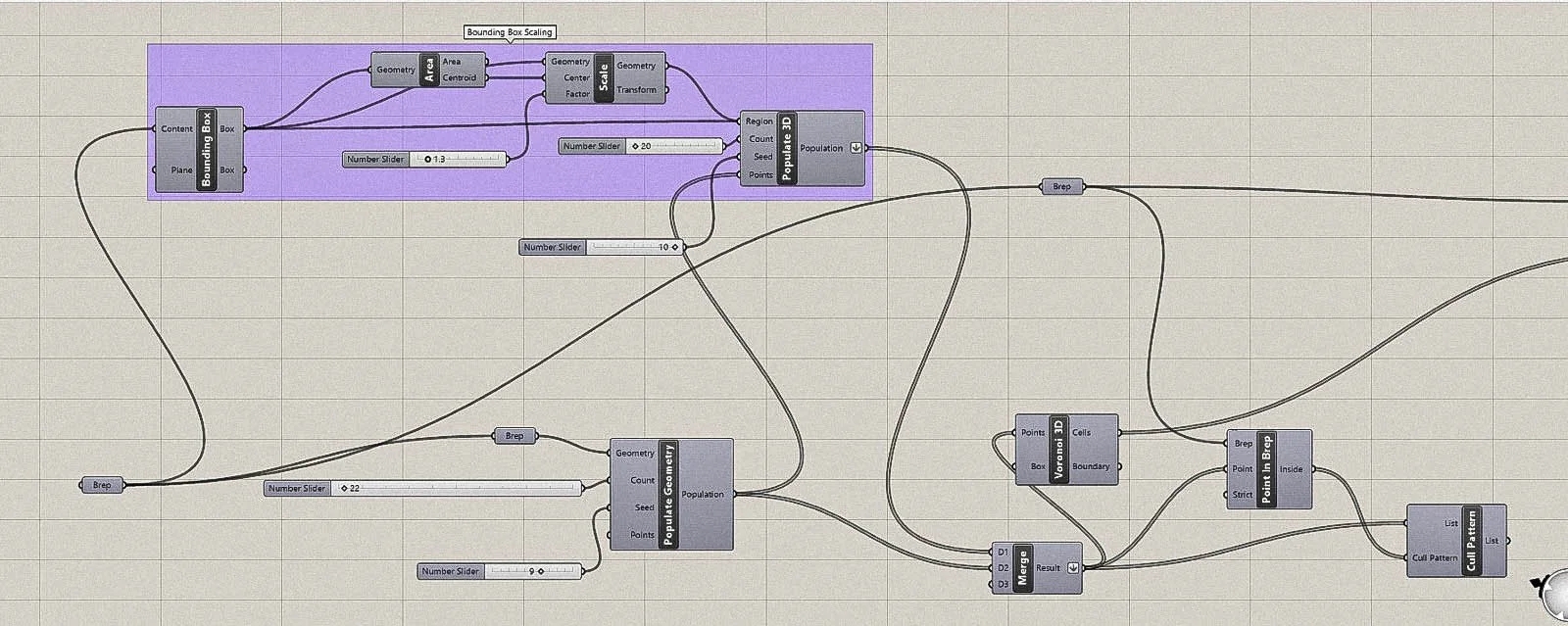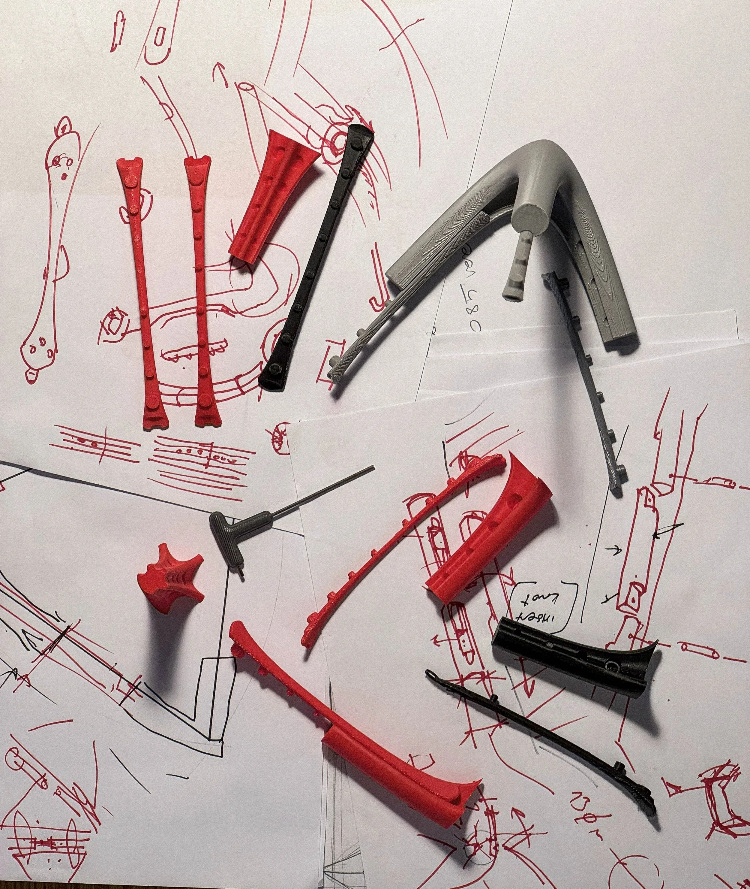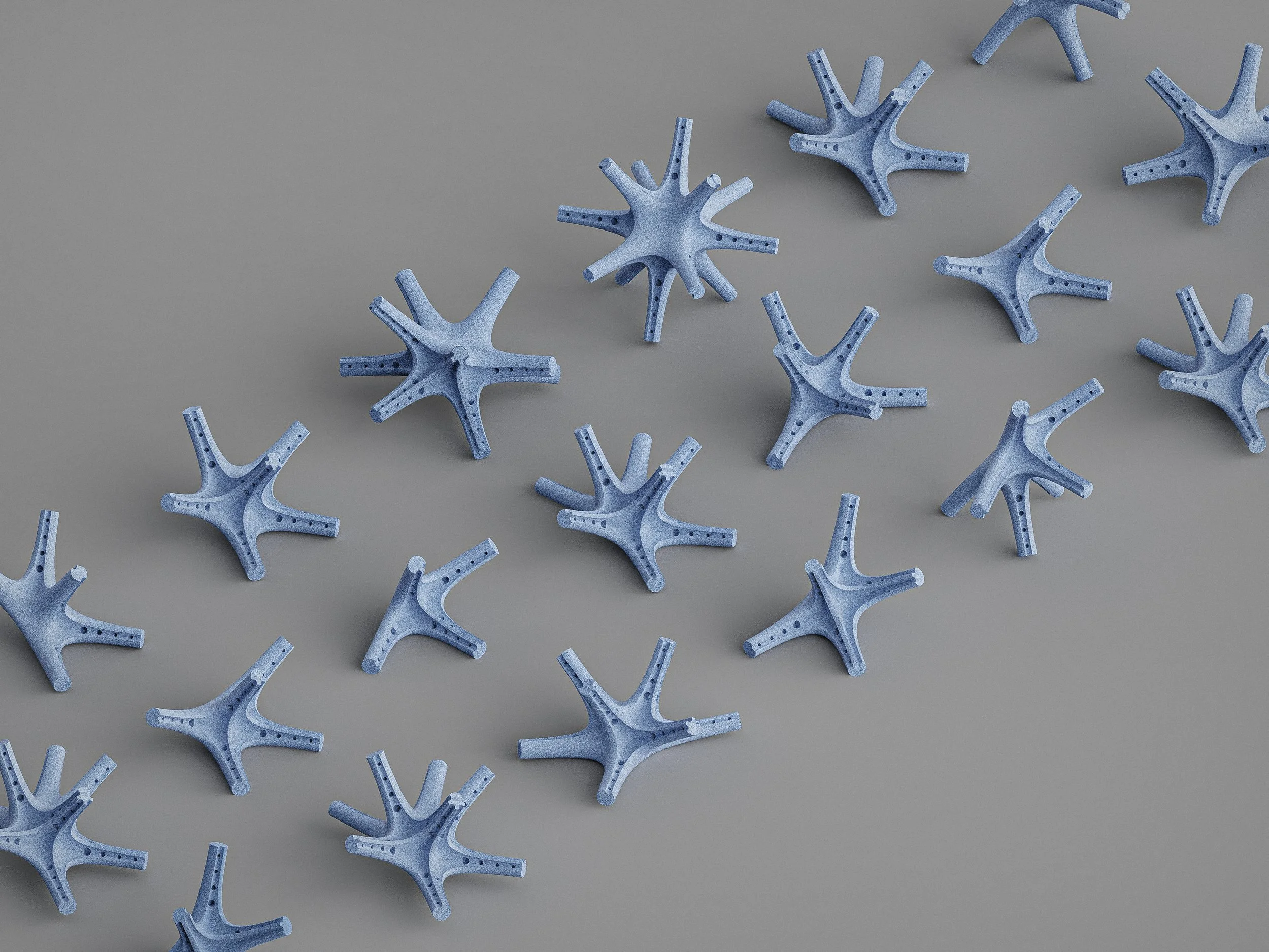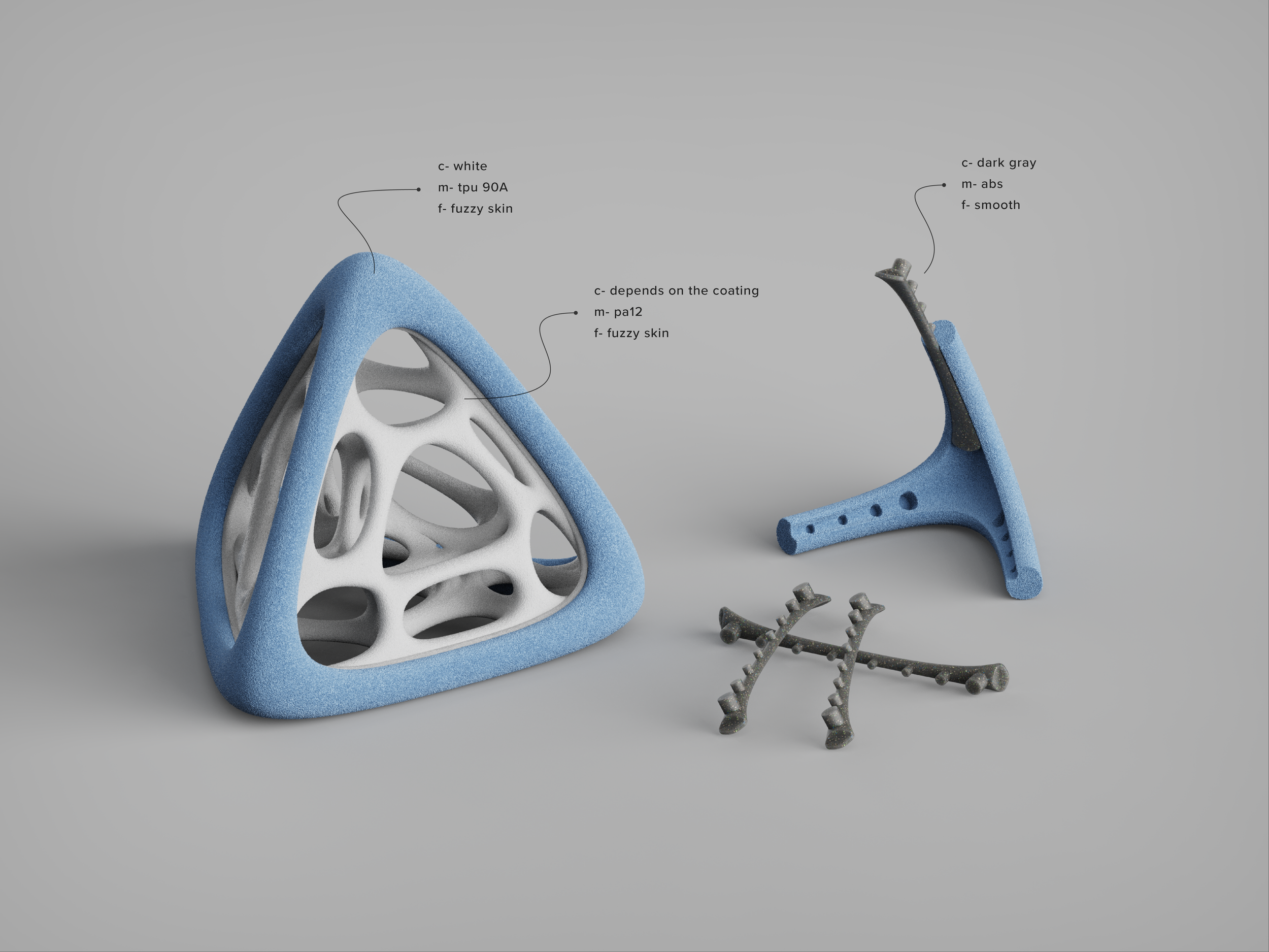 The tetrahedrons are connected to each other using two key components. The first are frames, parametrically designed based on the client’s preferences. The second are injection-molded connector pins made from an elastic material, which are universal for all frame pieces.
